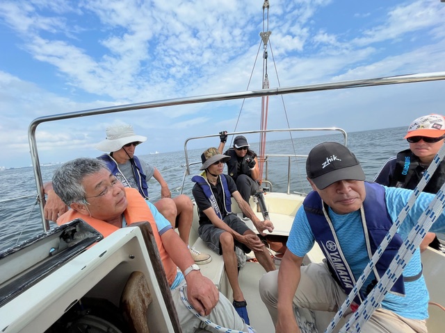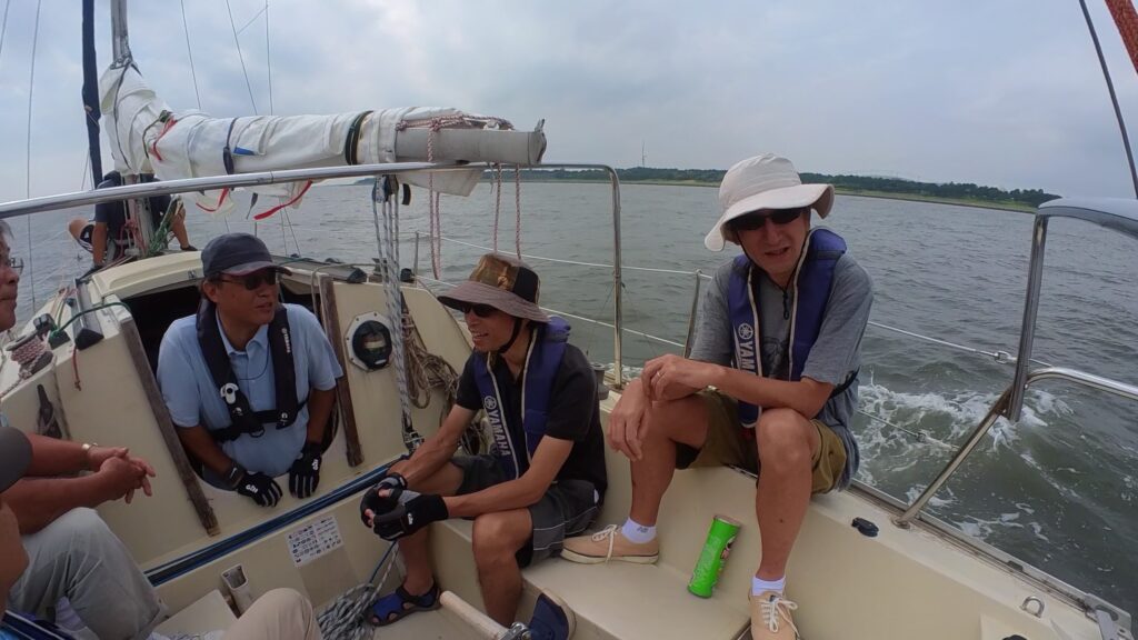 午前中は松戸さんがヘルムス、メインが水田さん、ジブは佐藤さんと長谷川さん、古庄さんはさまざまなサポートとアドバイス、スキッパーと解説はとのがいち、そえださんは海上の安全確認と万が一の際にはすぐにティラーをとれるようスタンバイ。
