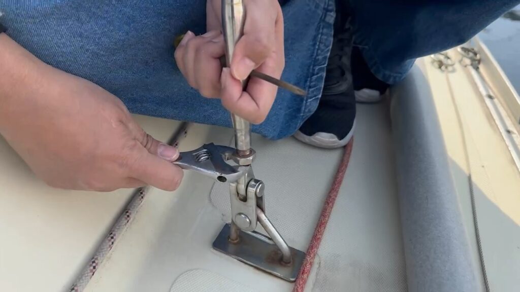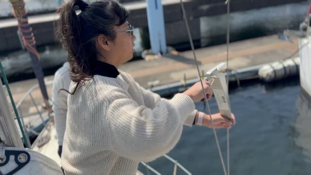 次に破断強度から数値を割り出し、それから、左舷と右舷のターンバックルを回転させ、ゲージの数値を基準値の26にしました。