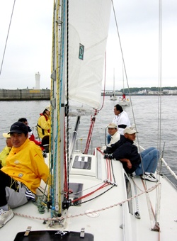 加藤さんにティラーを握ってもらい、村上さんがスキッパーとしてレクチャー。城ヶ島の沖を回り、ジブをおろして機走で東側からゆっくり三崎港へ入港?通過しながら昼食をとる。やっと「ちこ2」が追いつき、3艇揃う。