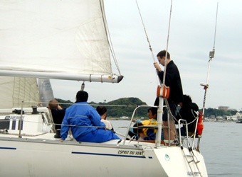 Endlich war es soweit. Wir gingen an Bord und verliessen den Hafen. Nach einem kurzen Manoever standen Gross und Genua, und Totsuka-san uebernahm das Ruder. Nach ein paar Wenden zum Warmwerden setzten wir den Spi. Nach einiger Zeit bargen wir diesen, und nahmen Kurs auf Chiba.