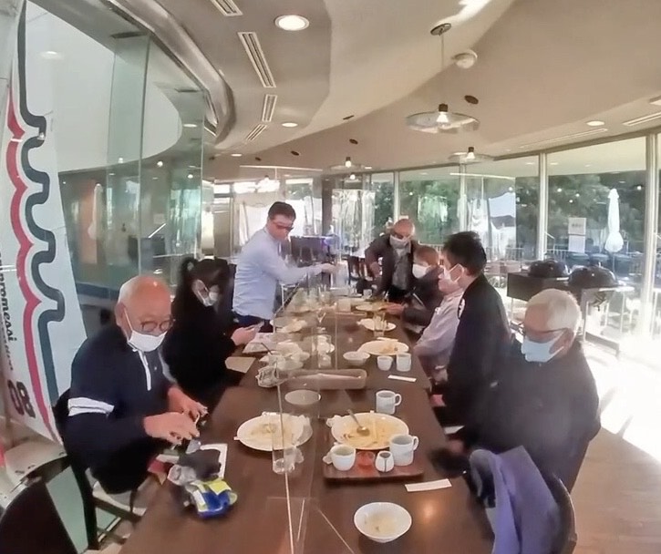 8にんでマリーナ2階のレストランへ行きました。プラスチックばんと、間隔をとって並べられた椅子に座り、東京支部代表のとのがいちさんが、一年の振り返りと、乾杯の音頭をとってくださいました。