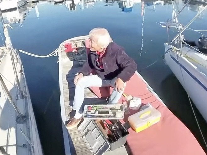 そして、ジブのリーチ部分のプラスチックが取れそうになっていたのを修復。頑丈に縫いました。「新しいセールを購入するまで、がんばって欲しいね。」と児玉さんがおっしゃっていました。