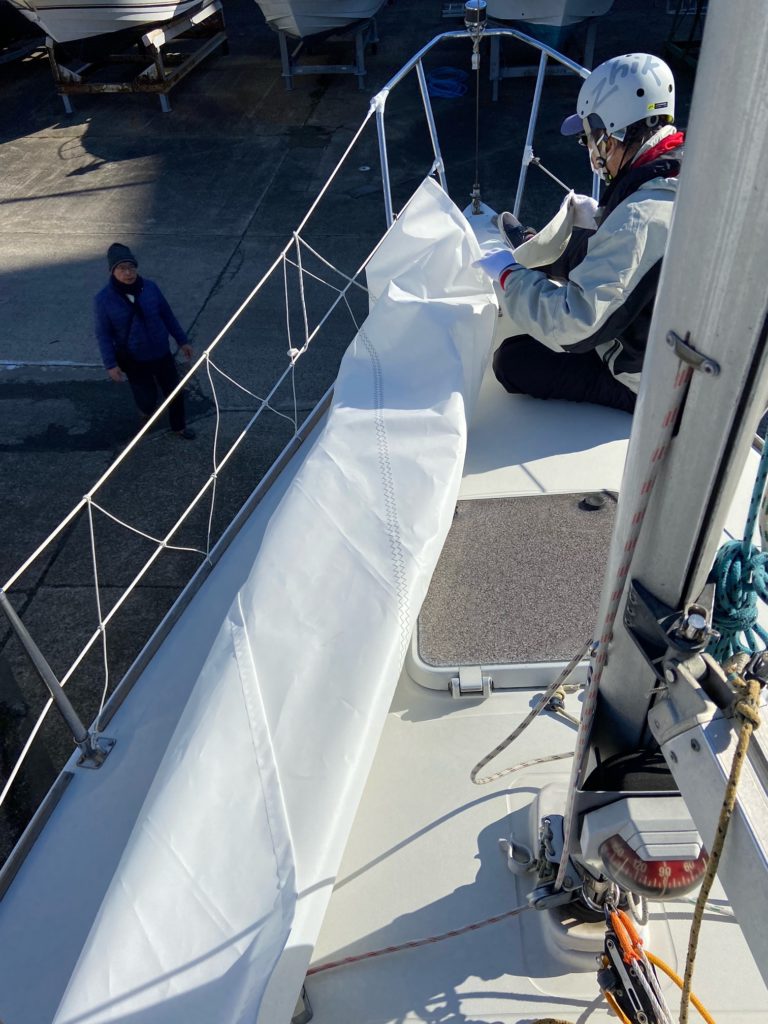 クラブハウスで会った後、私たちは帆袋から手付かずの新しいセールを取り出し、考えてそれらを取り付け始めました。帆を上げて写真を撮る機会があるだろうと。 設置に当たっては、先輩方からたくさんのアドバイスをいただきました。 帆はきついですが、素晴らしいものになることが確認されました。
