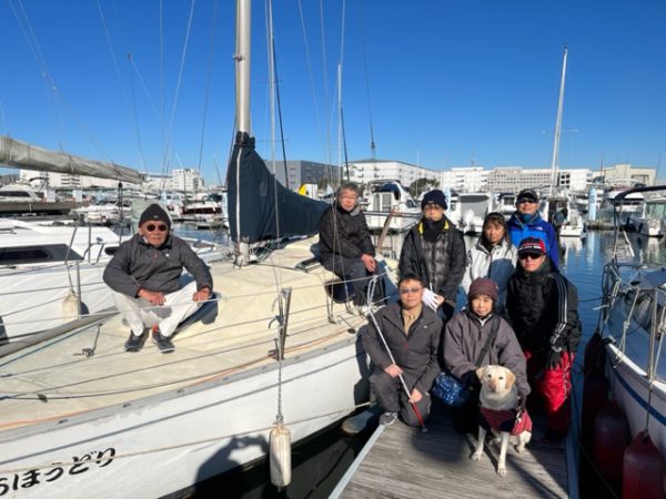 荒木さん撮影用ボートで出航。ルミナスはセールを上げるが風がなく、記念撮影のみで帰港。