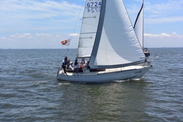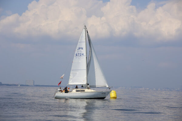 秋山サンはスキッパーで斎藤さんの脇から全体に、斎藤、に指示を出す。アランはジブセールと飯塚がモタモタしていると脇からアランの手が伸びてくる。ブームパンチに対しても体を張って対応してくれている様だ。ありがたいことだ。基本動作の訓練は早く卒業したいものだ。