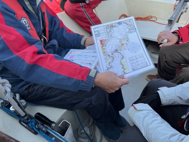 すぐにお昼となり、佐藤さんがティラーを担当。微風に苦戦するも結構走らせられることに成功されていたので、私もだらっとしているのもなんだなと、メインシートやトラベラーをいじって、佐藤さんのティラーに合わせる。