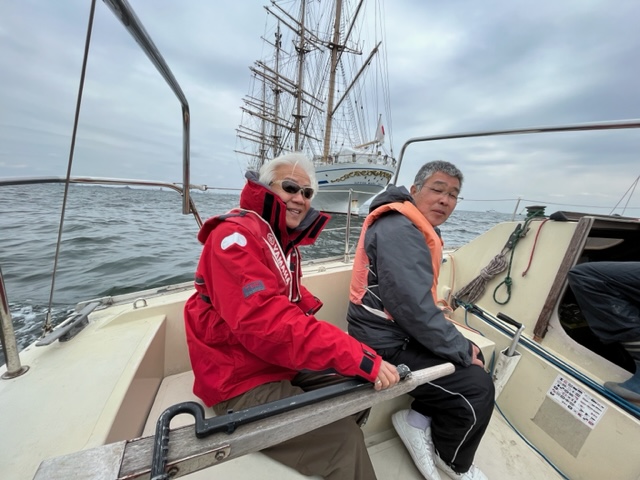 その後も風は順調で日本丸に出会いました。日本丸はいつ見てもノスタルジックで美しく格式のある船です。間近で見れるのもセーリングの醍醐味。勿論、記念撮影もばっちりです。