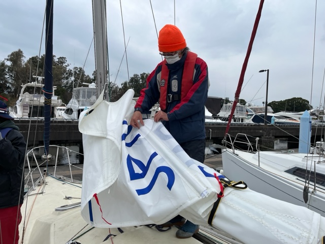 午後2時を回りそろそろ帰路に着きます。そこで永井さんからの案で、後ろから吹く風に「セイル観音開きで行きましょう」となり更に「スピンポールを使ってみましょう」とのことです。デッキの右隅にある細長いポール。あのスピンポールの出番が、ようやくきたのです。おめでとうスピンポール。用途はジブセイルのブームになるように三角形の底辺を固定し結びつけて、さらにマストに固定します。観音開きというの微妙の風でジブセイルが暴れてしまうのを防ぐ効果があるようです。ウィスカーポールの代用らしいのですが……。一応、私も「なるほど〜ウィスカー!」と、知ったフリをしてみました。セッティングは永井さん古庄さんの息のあったも動作で完璧。まもなくバースへ到着することができました。