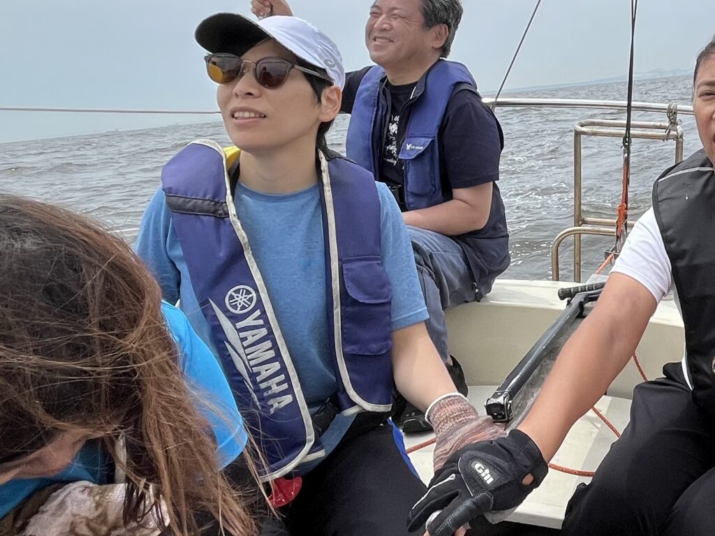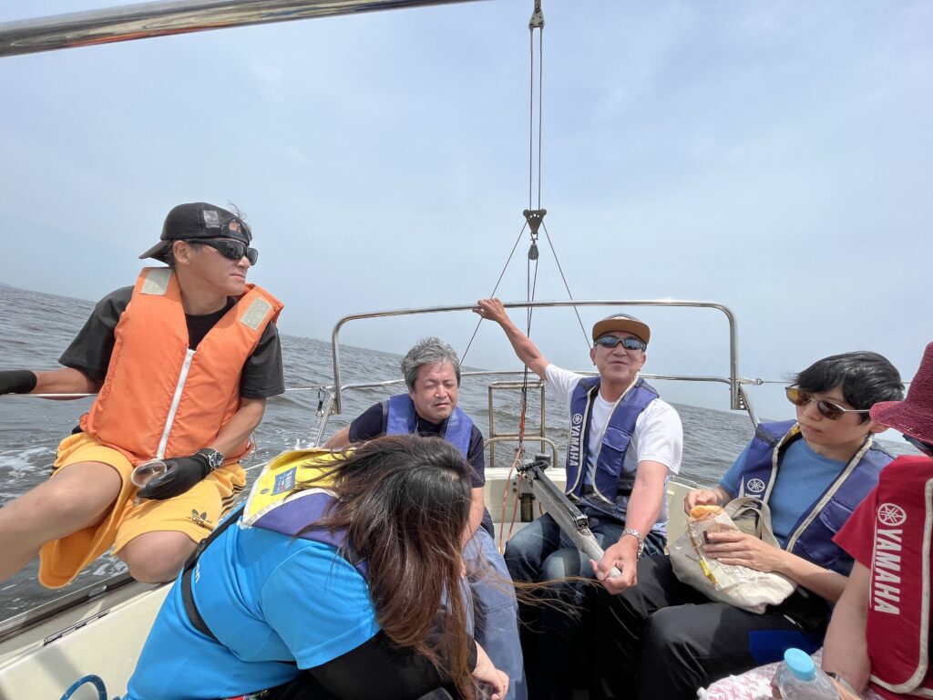 沖に出ると、風は凡そ6メートルぐらい、あほうどりは6のっと前後でセーリング。栗原さんにもティラーを持ってもらい体験。そしてここでも副田さんが適切に指示して、先ずティラーをもったら自身の体を両足と空いている片方の手を艇のデッキに捕まるなどして三点支持する仕方をアドバイス。