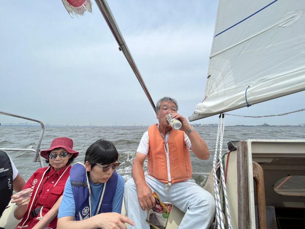 無事にセールアップ出来たところで、いつもの乾杯。今回はリースリングエルザスの白ワイン。各々が紙コップに継がれたワインを持ったところにあほうどりがうねりに突っ込んでしぶきが飛んで来る。東京湾の塩がワインに入り、やや塩味が加わって、なんとも美味でした。
