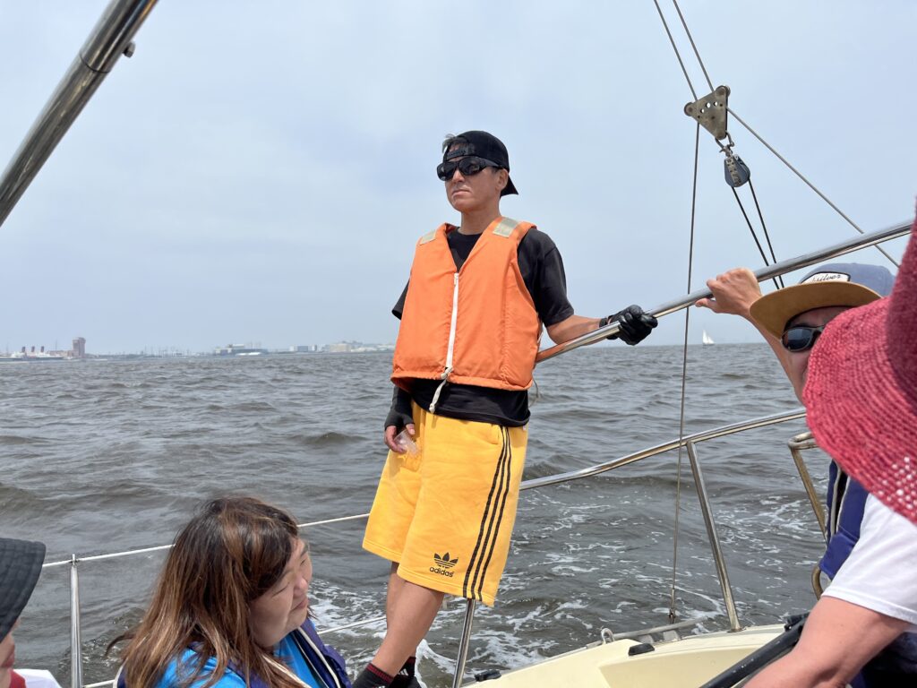 途中昼食をとったりしながらセーリングを続ける内に千葉沖に。三場さんが副田さんに見えている景色が変わったでしょう!と。13時40分、夢の島へ向けて戻り始めました。そこでジャイブするか、タックして落として行くか?副田さんに判断を促す。体験者さんがいるのと風がそこそこあるのとで、タックして落として、帰路へ。