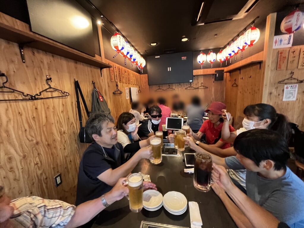 スポットライトの加藤さんにスポットライトについて尋ねたところ、運営主体が同行援護事業所のなんと「みつき」とのこと。「みつき」は私が唯一利用登録をしている同行援護事業所でブラインドのスポーツ関係の同行援護に力を入れているとかで、私はスキーに行くのが目的で昨年登録したのです。この事業所にガイドヘルパーとして登録している人の紹介でこの事業所に登録したのですが、その人ととはここ15年ぐらい毎年ブラインドのスキーで一緒に滑っているのですが、その人はスキーだけでなく、ブラインドのゴルフやサッカーまでもお手伝いをしていて、今回のもう一人の体験者栗原さんが所属しているブラインドサッカーのクラブの乃木坂でもプレーをしています。因みに乃木坂のクラブにはパラリンピックの金メダリストのブラインドも所属していて、彼は金・銀・銅全て別な種目で獲得しています。その彼ともブラインドのスキーで偶に会います。そして、乃木坂といえば、我らがJBSAの創始者である竹脇さんがお住まいです。ということで、簡単に全員が自己紹介をして、あほうどりへ。