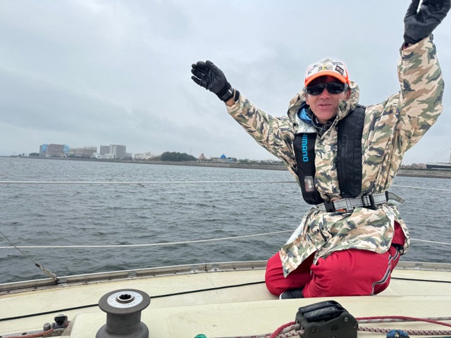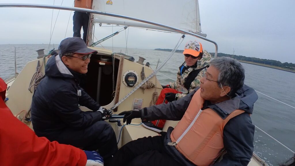 雨もすっかり上がり、若洲沖を目指します。東京湾は、ヨットの数も少なく釣船を数艇交わした後、広い海まで移動します。安全確認後、メインセール、ジブセールを上げました。引き続きへルムスパーソンは玉木さん。スキッパーはミジップにいる永井さんです。永井さん号令のもとタック&ジャイブを繰り返します。殿垣内さん曰く「菱形の走行経路」をイメージし、レース想定。上マーク下マーク回航になります。するとそこでハプニング‼古庄さんのズボンが床面にずり落ちました。ズボンのゴムものんびりゆったりされた様子です。「副田さんは見ちゃダメだよ。」と、古庄さんキャビンでお直し。失礼しま〜す。