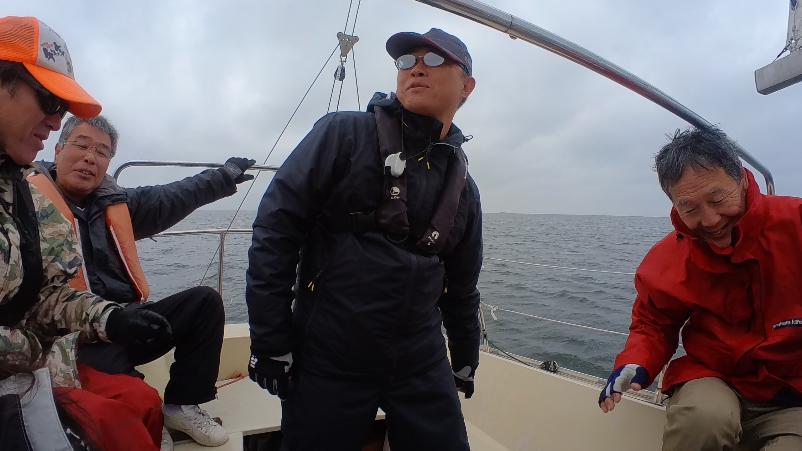 玉木さんの機走にて出航です。風が全身に刺さります。寒さ対策が万全な方と、そうでない方と、分かれております。というのも、いきなりの真冬の気候。私のミートテック(脂肪素材)も効果がありません。最高気温8°cというところでした。永井さんと私、雨具を二重に重ねて寒さ対策をしました。小雨はまだ残っています。