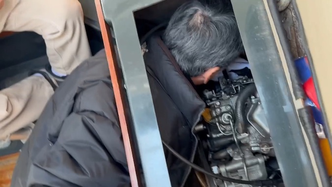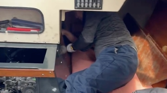 次にギアオイルの交換作業。裏側にあり、なかなか手が届かず、左舷クウォーターバースから手を入れながら、狭いところでの作業。私にできることと言えば、手元にあかりを照らすことぐらいでした。