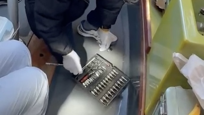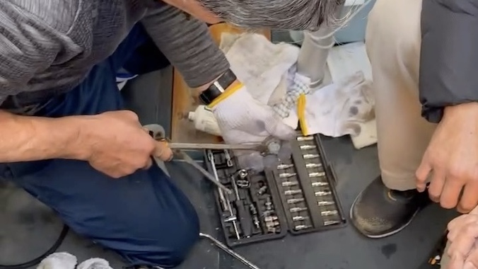 ドロドロになるのを覚悟し、気合が入っていた私ですが、玉木さんがスパナを手に取り、ボルトのサイズを確かめ始めて・・・。と、そこから最後まで玉木さんが作業してくださいました。私がやったことといえば、玉木さんのサポートをする児玉さんのサポート、そしてゴミまとめや工具の整頓でした。