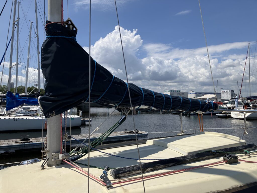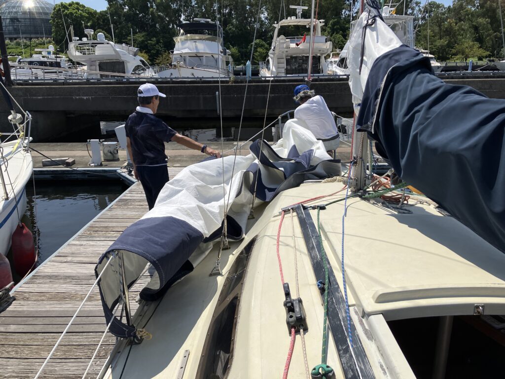 前回一緒に台風対策をした玉木さんは、お一人でフェンダーチェックとメインセールをぐるぐる巻きに。