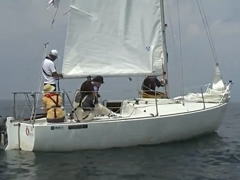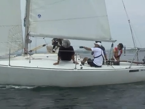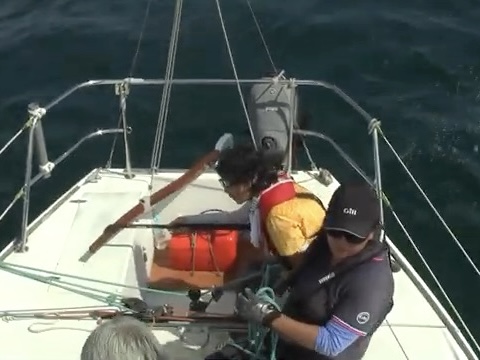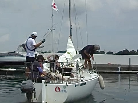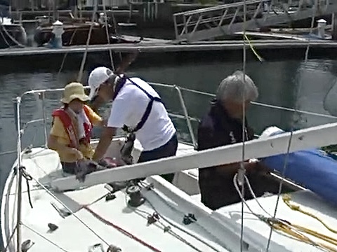 盲導犬を事務所に預けるシーンからスタートです。その後、サイテッドがブラインドをガイドして、ポンツーンに繋がれたルミナスに乗艇しました。全員揃っての艤装シーンでは、ブラインドがメインシートをブームに取りつける作業を行いました。出艇前には全員が船のバウに集合し、「オー!」と腕を上げるシーンも撮影されました。