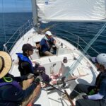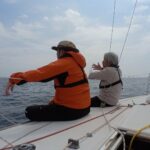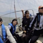 初心者とベテランが、目が見える人と見えにくい・見えない人が、一緒にヨットでブラインドセーリングを楽しんでいます。