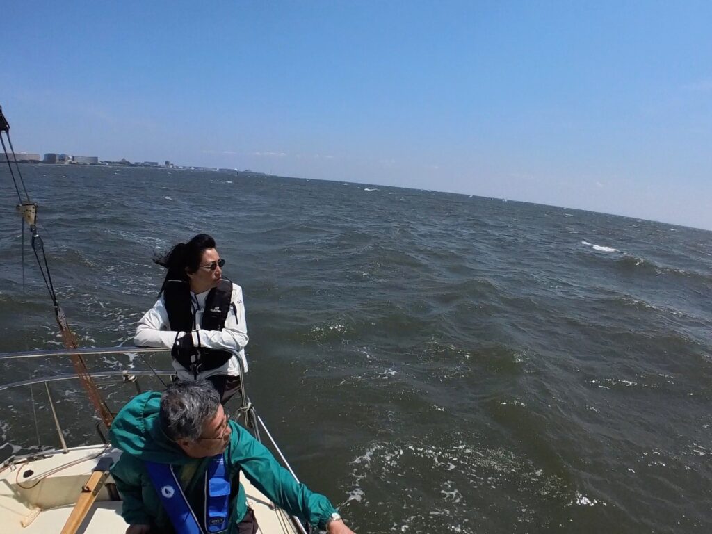 そして、ジブセールのまま、タック。今度は左舷でスプレー、バシャバシャです。雨具を着用してなかった私。ずぶ濡れにはなりましたが、荒れた東京湾を経験できて、楽しかったです。