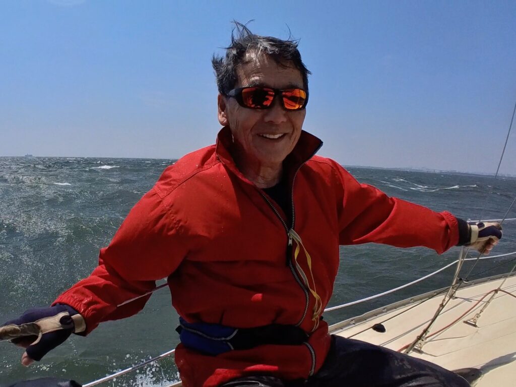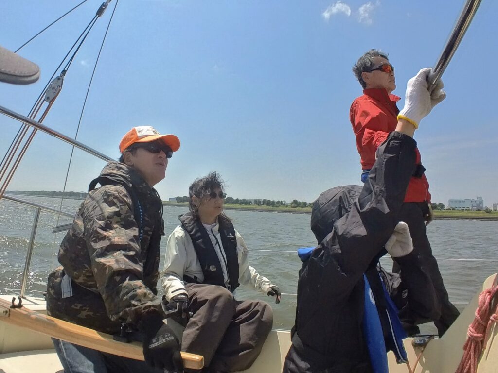 OB杭を抜け、いよいよセーリング。ワンポンの予定でしたが、話し合いの結果。メインセールは上げずにジブセールのみとなりました。風力の軸が船頭になるため、難しいティラー操作となります。しばらくは古庄さんの操作で、進みます。