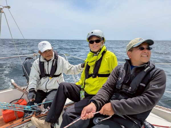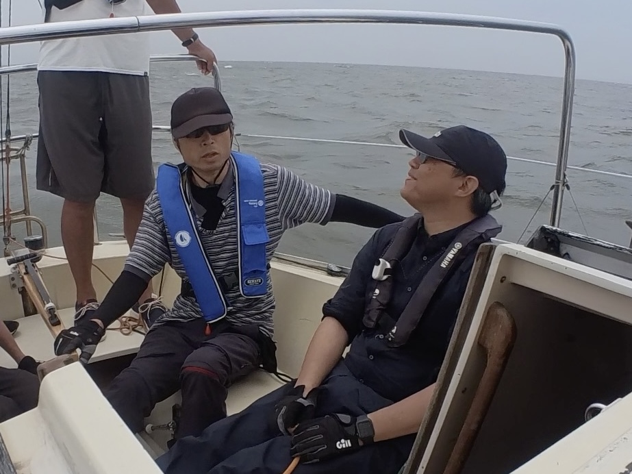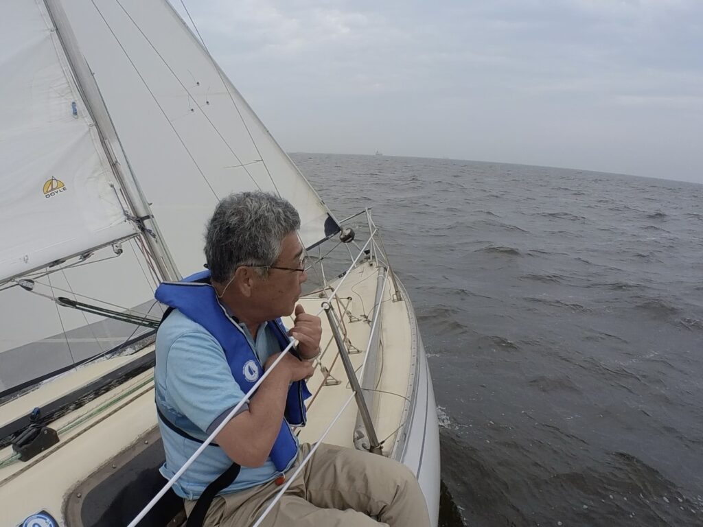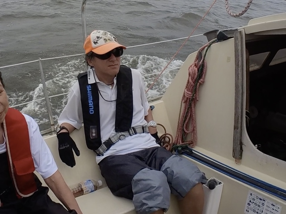 折り返しはやや風が収まり、メインセールもあげました。ティラーは、とのがいちさんに、バトンタッチ。メインシートトリマーからヘルムスへ、忙しいポジションです。