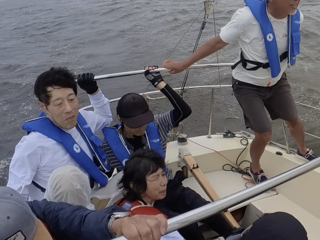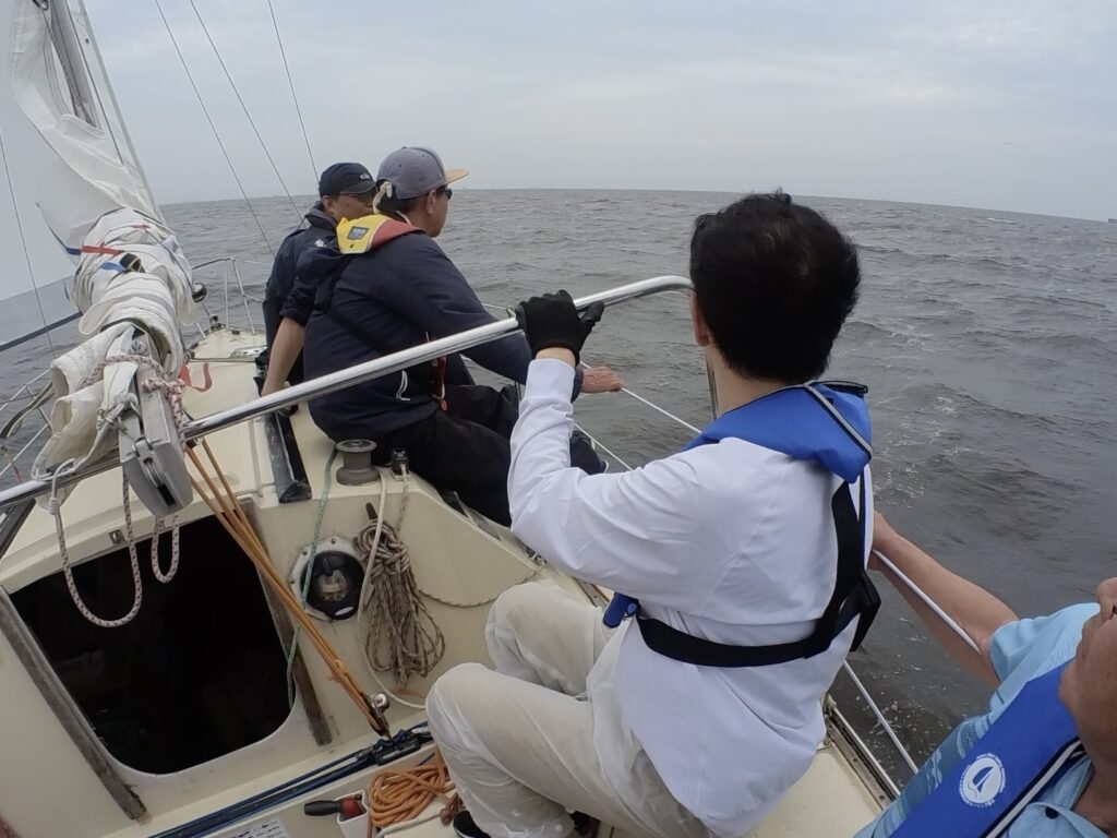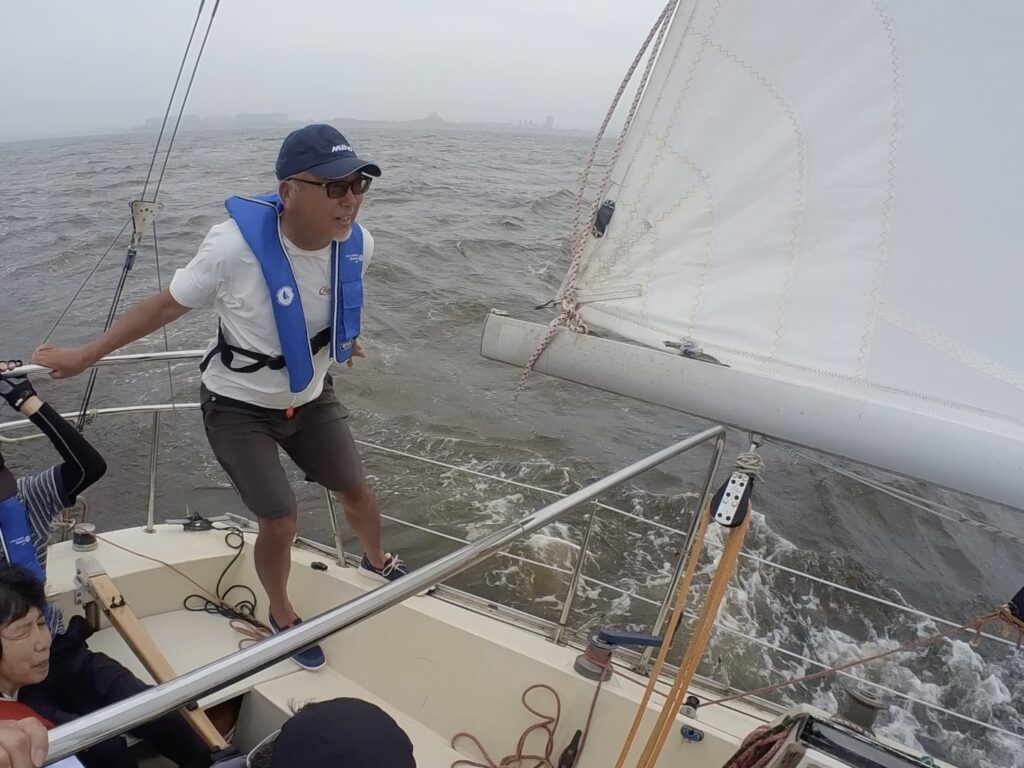 沖に出て、ジブセールのみで走行開始です。前回の定期活動同様、軸がバウ側になるので、バランスを探る必要になります。古庄さんお見事です。