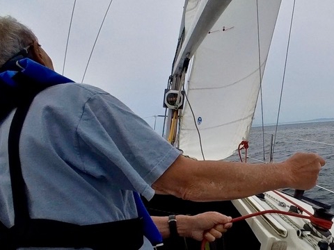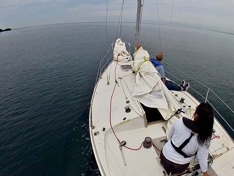 まずは、ヘルムス1年生のとのがいちがティラーをもち、そえださんはジブの練習を、風速2から5ノット程度の微風下で、1時間半ほどおこないました。集中力を切らさないことも意識。