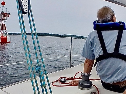 約70回のタックとジャイブを繰り返し、多数のタコツボと赤白ブイをマークに見立てて、ロスレスを意識した練習をしました。