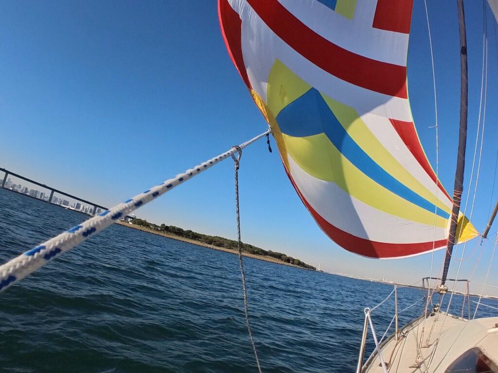 主にうしろから風を受けて走る時、ヨットの一番前に、巨大な袋のような帆をはり、ヨットをひっぱるセールにスピンネーカーというものがあります。