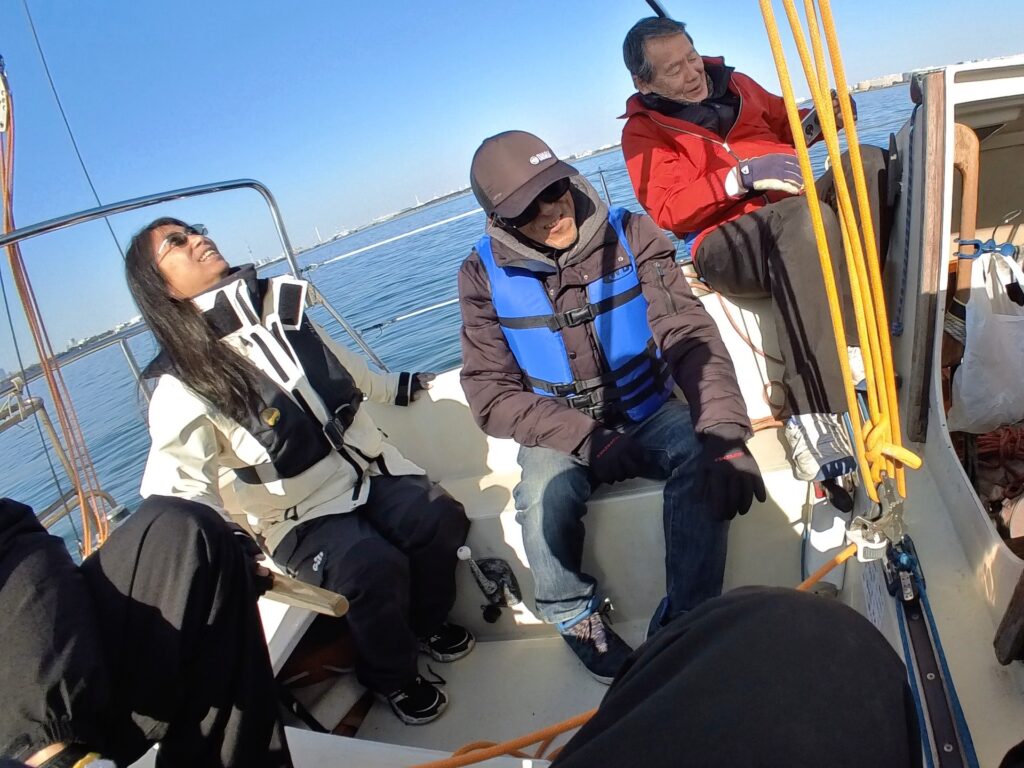 昨年6月に強風のなかでの体験セーリングをして以来の藤崎さんは、迫力あるスポーツセーリングを想像していたようでしたが、前回と全く異なる様子に、まるでヨット詐欺にでもあったかのような空気だったので、こんな日はお酒でも持ってくればよかったですねぇといったところ、たぶん前回,、堀江さんか長谷川さんが持ってきてくださったイーチコがちょうど人数分残っているとの玉木さんの報告。