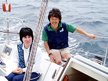 二艇一緒に江ノ島方向にセーリング。天気はピーカンという程ではないがセーリングにはもうしぶんのない天気。風は北北東位かな、うねりもなく4?5メートルいうところ。村上さんにヘルムサポートをしてもらい、安西はセールトリムをサポートしなら前の船の後ろにつく。メンバー全員交代しながらスキッパーを楽しむ。だいぶ前の船に近寄る、そこですかさず「ぶつかる寸前までこのままでいいよ」と言う。ちこは少しレース的雰囲気を楽しんでま?す。
