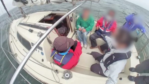 練習海面は赤白ブイを行き来する形で、ヘルムスとメインシートトリマーを交代で石塚さんと杉山、ジブシートトリマーをアランさんが担当し、クローズドホールドでまっすぐ走らせること、そして、タックとジャイブの練習を石田さんと中尾さんの指導で、行いました。