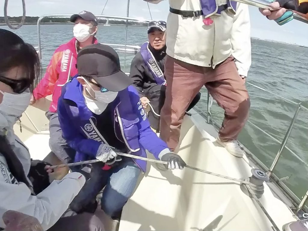 前回の体験セーリングと同様、ライフラインをつたってバウやスタンを体感してもらいました。
