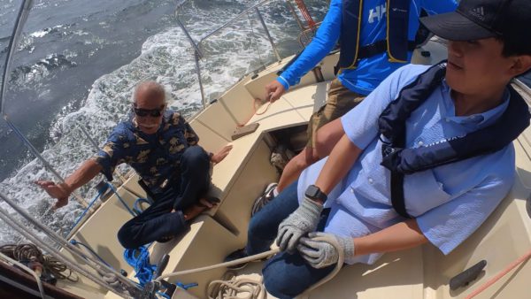 また、神奈川支部の荒木さんも来てくださり、8/21のあほうどりのメンテナンス作業の続きをしてくださいました。荒木さんによれば、「ヨットは美しくないといけない」とのこと。「美しい」とは、すなわちこまめにメンテナンスがされている証ということでした。まだヨットの細かなパーツの仕組みが理解できてない私には説明しきれませんが、とにかく出港前から航行中もずっとあほうどりの調整をしてくださっていました。本当にありがとうございました。