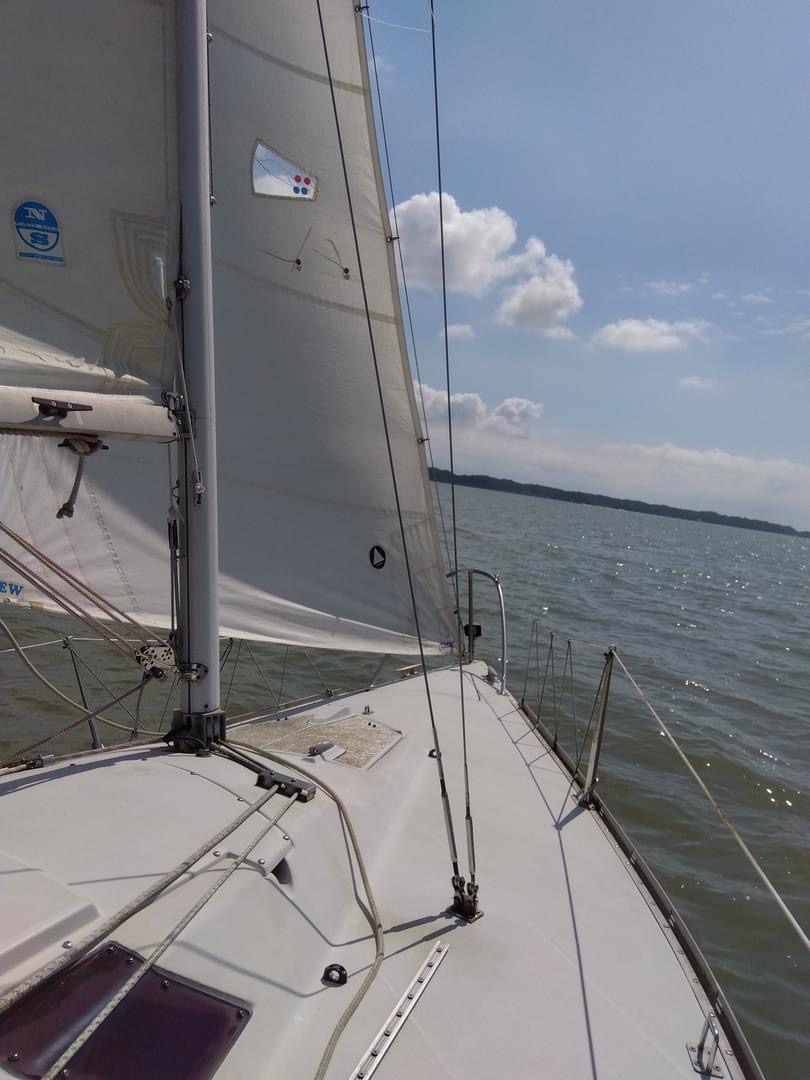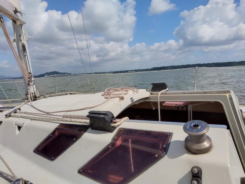そこで今回は操船の感覚を取り戻すことを目的に、山田さんと森崎がティラーとメインシートを交代しながら、ずっと走らせました。穏やかな秋空の下(まだ少し陽ざしがつよかったですが)、アンカリングすることもなく、それぞれに持ち寄った物をシェアしながらのランチタイム。時にはシーホッパーの練習レースを観戦しながらと。久々のメンバーとの再会、のんびりとセイリングを存分に楽しみました。
