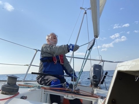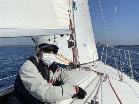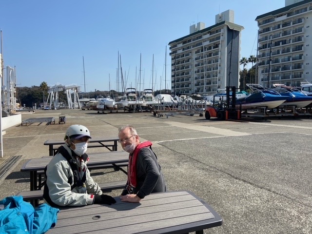 12:45 風弱くセーリングしながら交代で手短に昼食、飯塚さんジブトリマー初体験