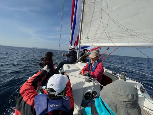沖に出て古庄さんがラットを操作しました。そうなのです!今回はティラーではなくラットなのです。古庄さんはクルーの方から「操作が上手ですね」と褒められて「風に乗るのが得意なんです」とご満悦の様子でした。