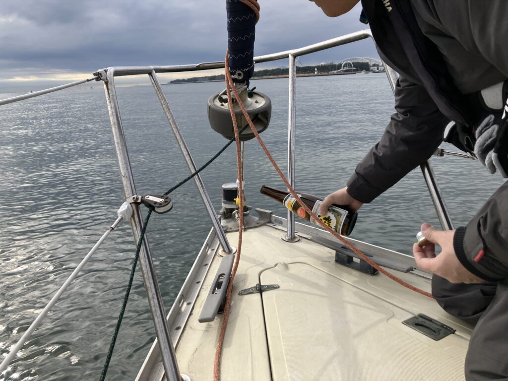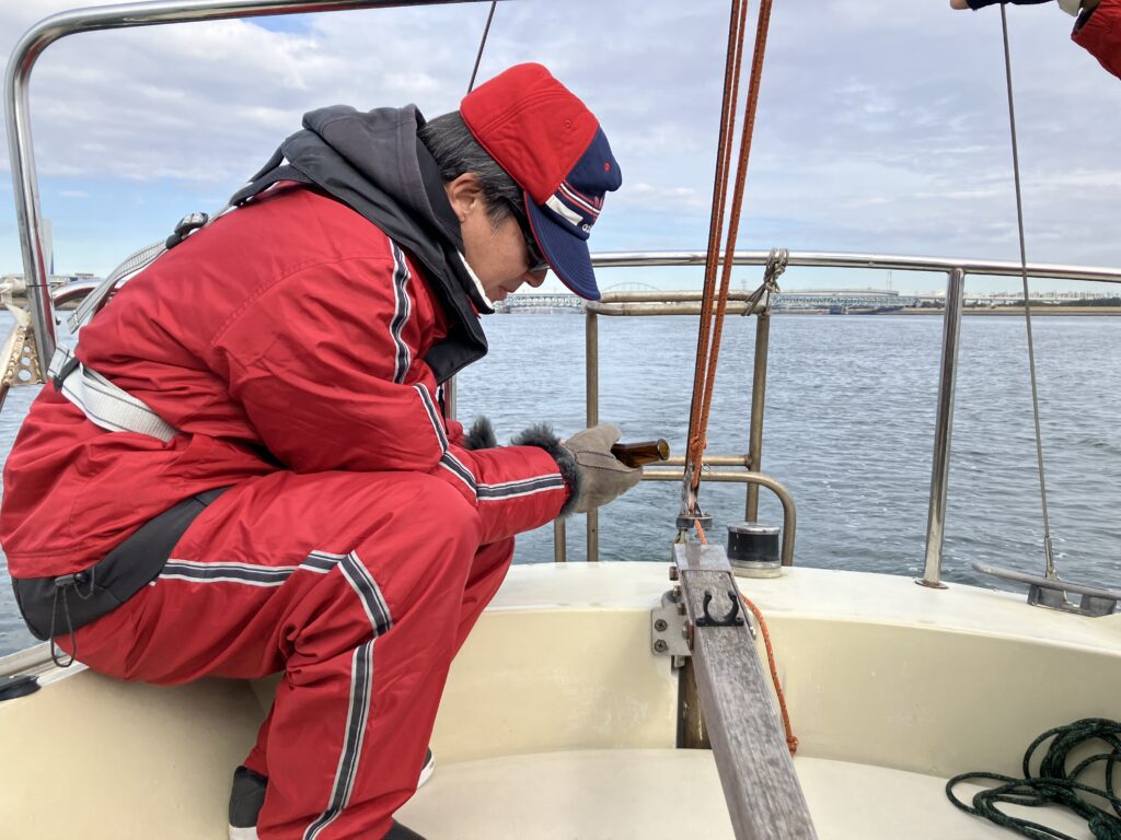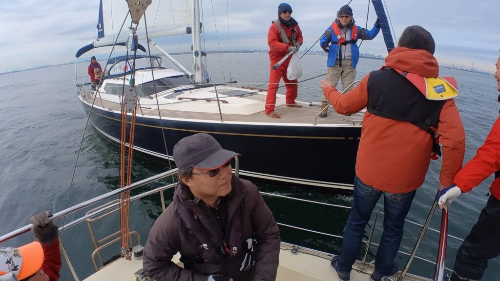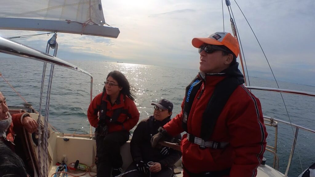 若洲沖手前でメインセールをあげます。なんと私が皆さんに指示を出すこととなりました。といっても、皆さんベテランなのでこちらがお願いするのを優しくフォローしていただきました。慣れなくてすいません。