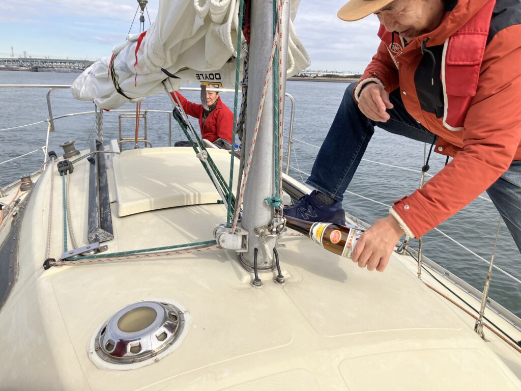 Tバース、あほうどり久しぶりです。元気な様子でした。玉木さんの機走で初出港です。出港してすぐ、お清めをさせていただきました。パウ、マスト、ティラーそれぞれに、お清め安全祈願をさせていただきました。安全な航海、いつもありがとうございます。