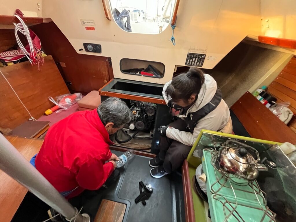 風がなくなり、機帆走。私から副田さんにティラーバトンタッチです。機帆走とても順調で時間をかけながらマリーナに戻ります。今年最初のセーリング。下ネタなしの会話からも察していただきますように、とても楽しくのんびりできました。気がつくとマリーナまで戻っていました。ありがとうございました。