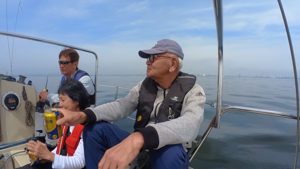 1時間と少しかけていった道を、戻る。機走だったが、ティラーをみずたさんが握る。初めはそえだがサポートをしていたが、途中から、体験者さんにご指導していただく。このかたは、パラリンピック監督としてご活躍なさったかた。みずたさんに指導していらっしゃる内容を聞き漏らさないように、耳を大きくして聞いていた。その横では、「お疲れさま〜!」と、乾杯の声が聞こえた。なんともいえない幸せを感じることができた。