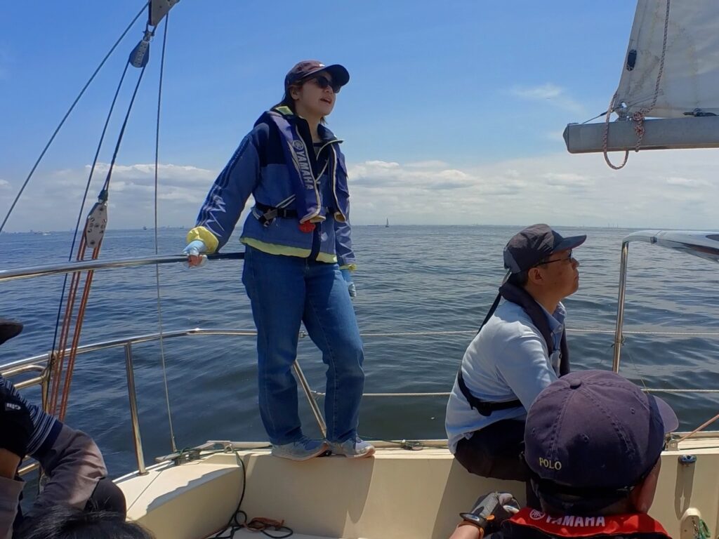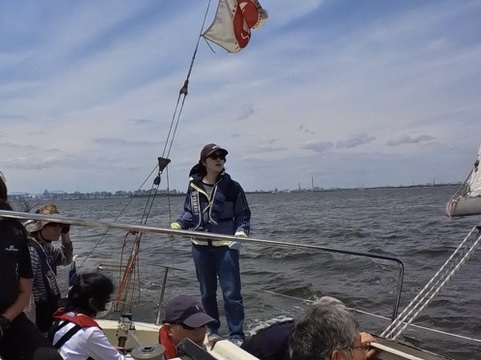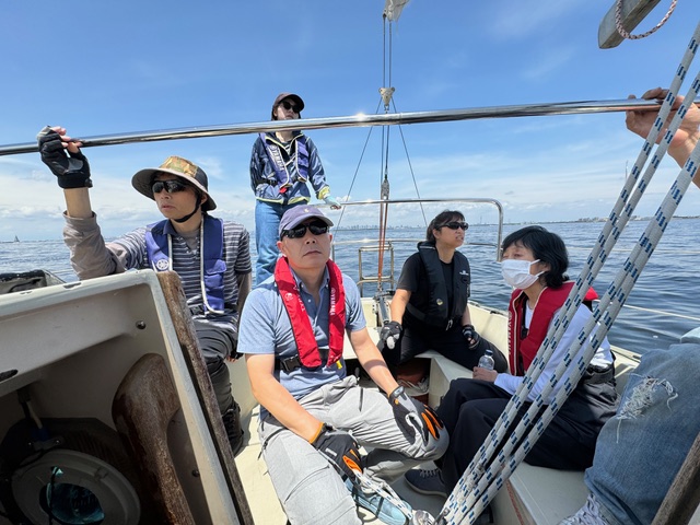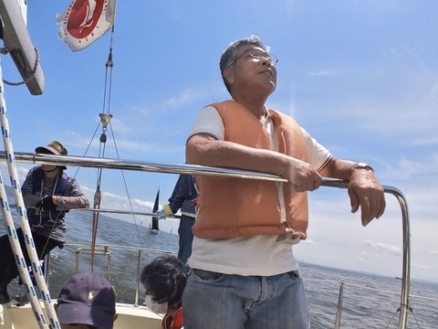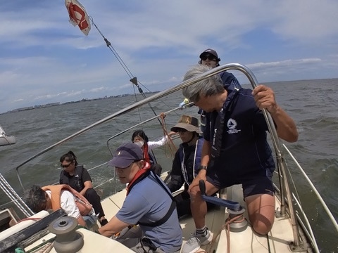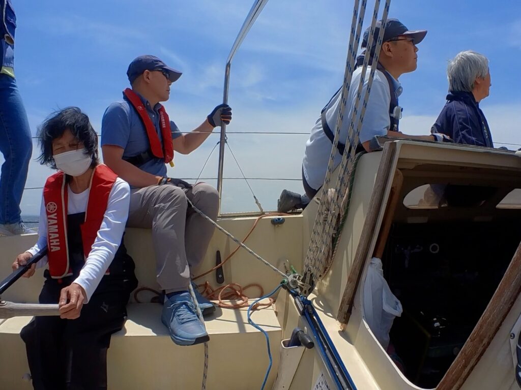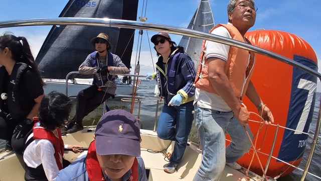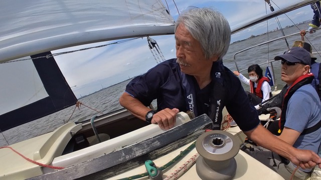 ヘルムスは小倉さん、メインセールトリマーは金子さん、ジブセールトリムはそえださん、古庄さん、安西さんは総合アドバイザー、とのがいちはカメラマンと雑用係、水田さんはのぼりで交代できたらヘルムス要員でしたが色々ゆとりがなく今回は帰りに練習しながら帰ってきたときのヘルムスでした。