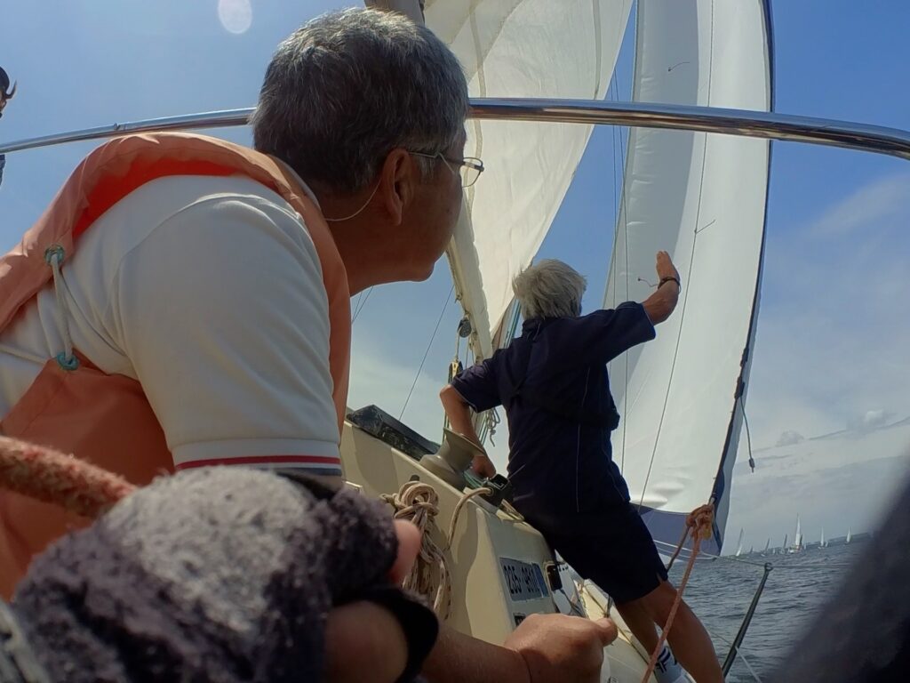 当日の朝は軽風でしたが、レース海面に到着した頃には微風へ。そんな中でのスタートは、どの艇もジャストスタートは難しかったと思われます。不安定な風ではありましたが、スタートラインを切るとワンタックのポートアプローチで上マークへ。この頃には風も次第に上がってきました。スターボー艇をうまくかわしてタックの後はベアと順調でしたがここでトラブルが、そしてマークタッチ。しかし、スキッパーの松田さんは動揺することなく次の指示を出します。このレグでは後続艇をやり過ごして一回転。風はランニングからクォーターリーへ。下マーク回航は慎重に。3レグでは風がさらに上がり快調な走り? いえ、ウェザーヘルムでアングルを維持できないヘルムスマンです。4レグは流し込みフィニッシュ。初めてスキッパーを担当してくださった松田さん。そのぶれない指示は圧倒的でした。ご参加くださった皆様、どうもありがとうございました。