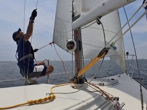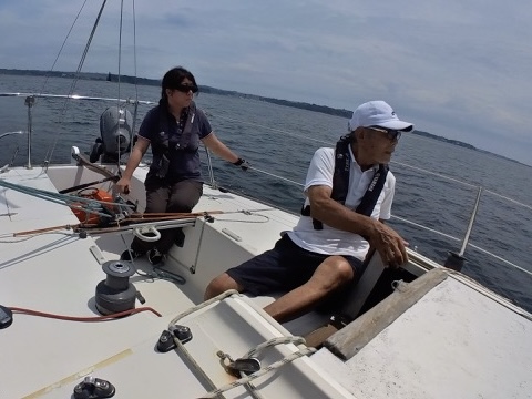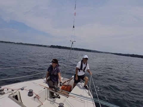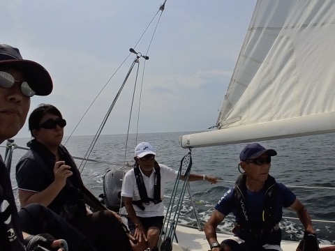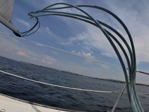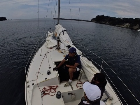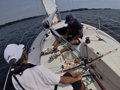 前回報告書に記した、私の課題である下マーク回航でのメインセールトリムを、下架を持っている間に座学で教えていただき、実際に挑戦。何回かトライしたうちの、1回だけはうまくいったが、あとは話にならなかった。まさかの、メインセールシバーを繰り返す。