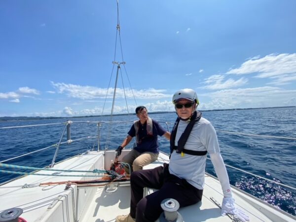 佐藤さんは、一番にサンシェードをつけて日陰を作り、その後スピンハリをパルピットとクリートにもやいをして、フォアステイの補強をしてくださった。